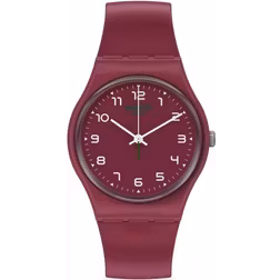 Et flot ur fra Swatch som er udstyret med en rød urskive. Urglasset er ridsefast, da det er lavet af mineralglas. Viserne er af den traditionelle, analoge slags.Læs mere